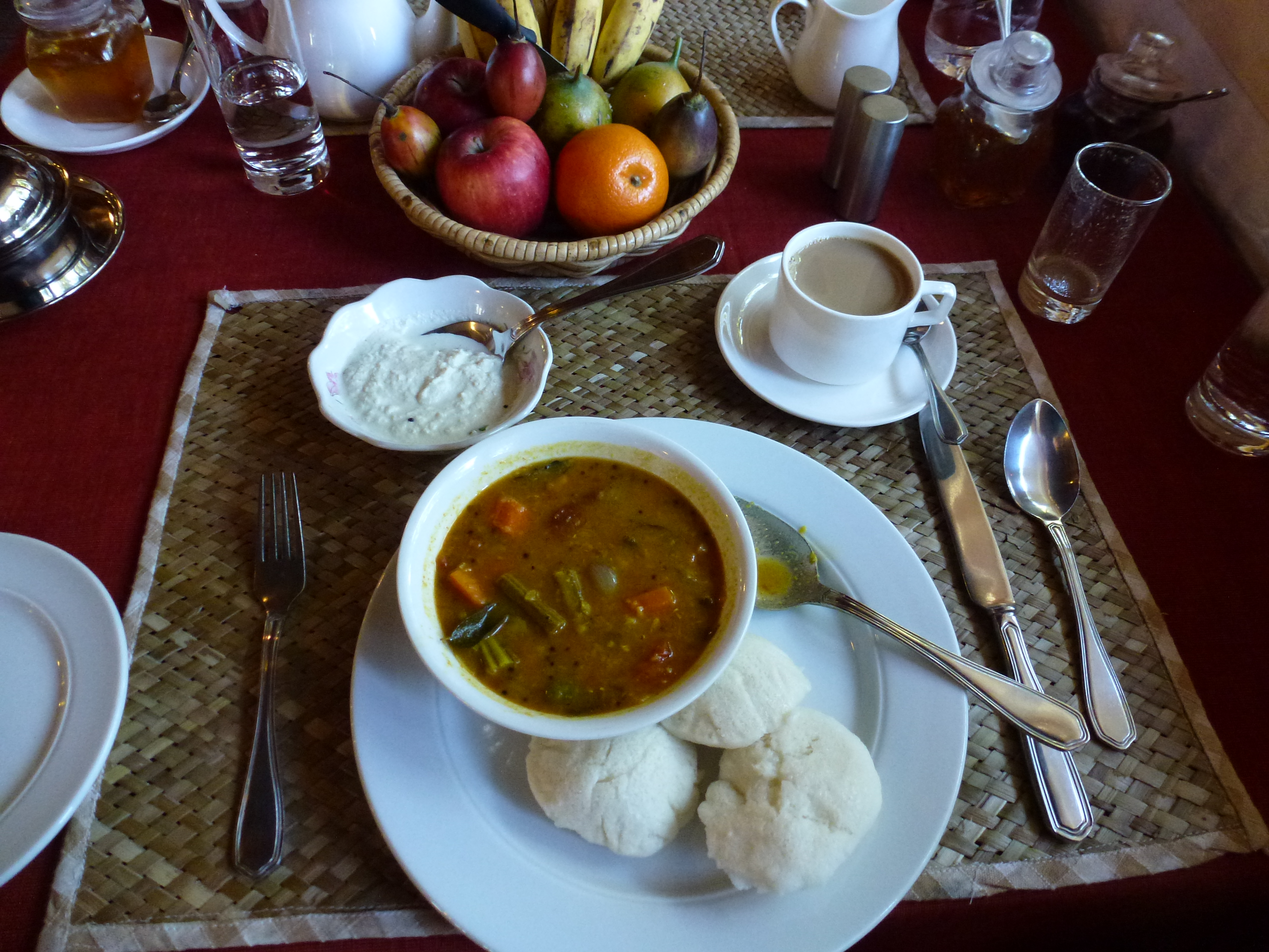 I go because so much is new and exotic, especially the mornings. Beautiful birds, I don’t even know their names, sing sweet songs in the garden, just outside my window. The sun creeps over the mountain and shines on the east slopes across the valley, bringing to life tea plantations that go on for as far as I can see. A comforting smell of wood burning to fuel fires for breakfast blends with a faint aroma of simmering curry. It’s time for breakfast.