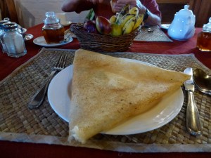 Breakfast is a food-lovers delight. I love Indian breakfasts. Dosas, pizza-size, paper- thin rice flour pancakes, are served with sambar, a spicy, thick, yellow lentil and vegetable soup served with chutney, coconut, tomato and/or my favourite, coriander chutney. For variety, instead of dosa I ask for idli, an uncooked-looking feather-light rice dumpling that I dip into the mouth-watering sambar.