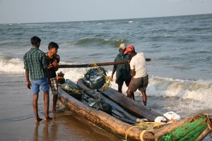 A long open boat surfs the waves as it approaches and it is skilfully turned broadside at the beach. Two fishermen jump out and with a long pole between them, sling a heavy motor off the stern and march it up the beyond the high tide line. Then they quickly return to the boat to hoist off two bales of fish as the faces of enthusiastic onlookers light up with the sight of the catch.