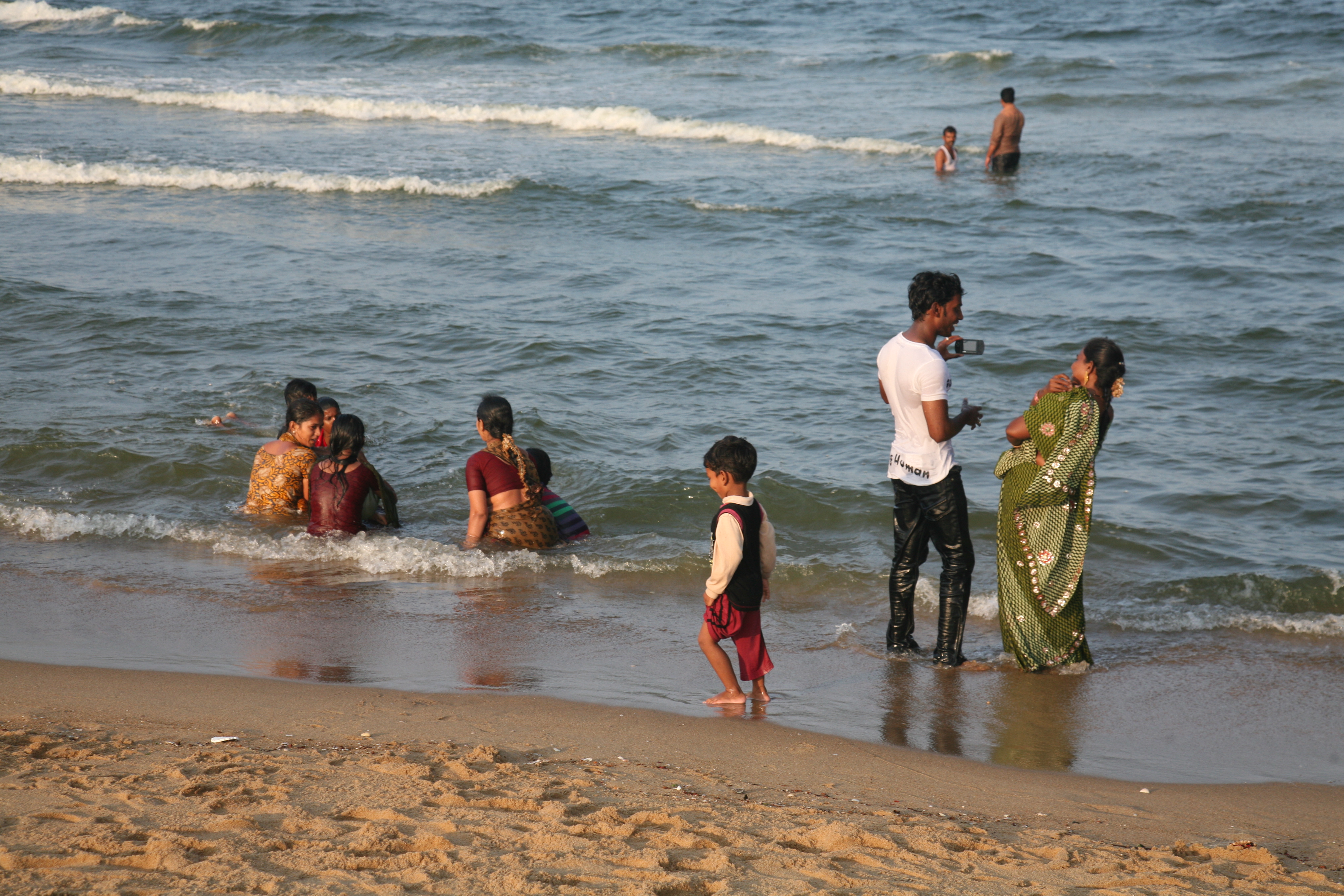 Down at the beach, a group of kids chase a floating red ball. Two Moslem women join in the fun and plunge into the surf, fully clothed in their long back robes. Three sari clad Hindu friends, who are also being soaked and tossed about in the surf, cheer them on.
