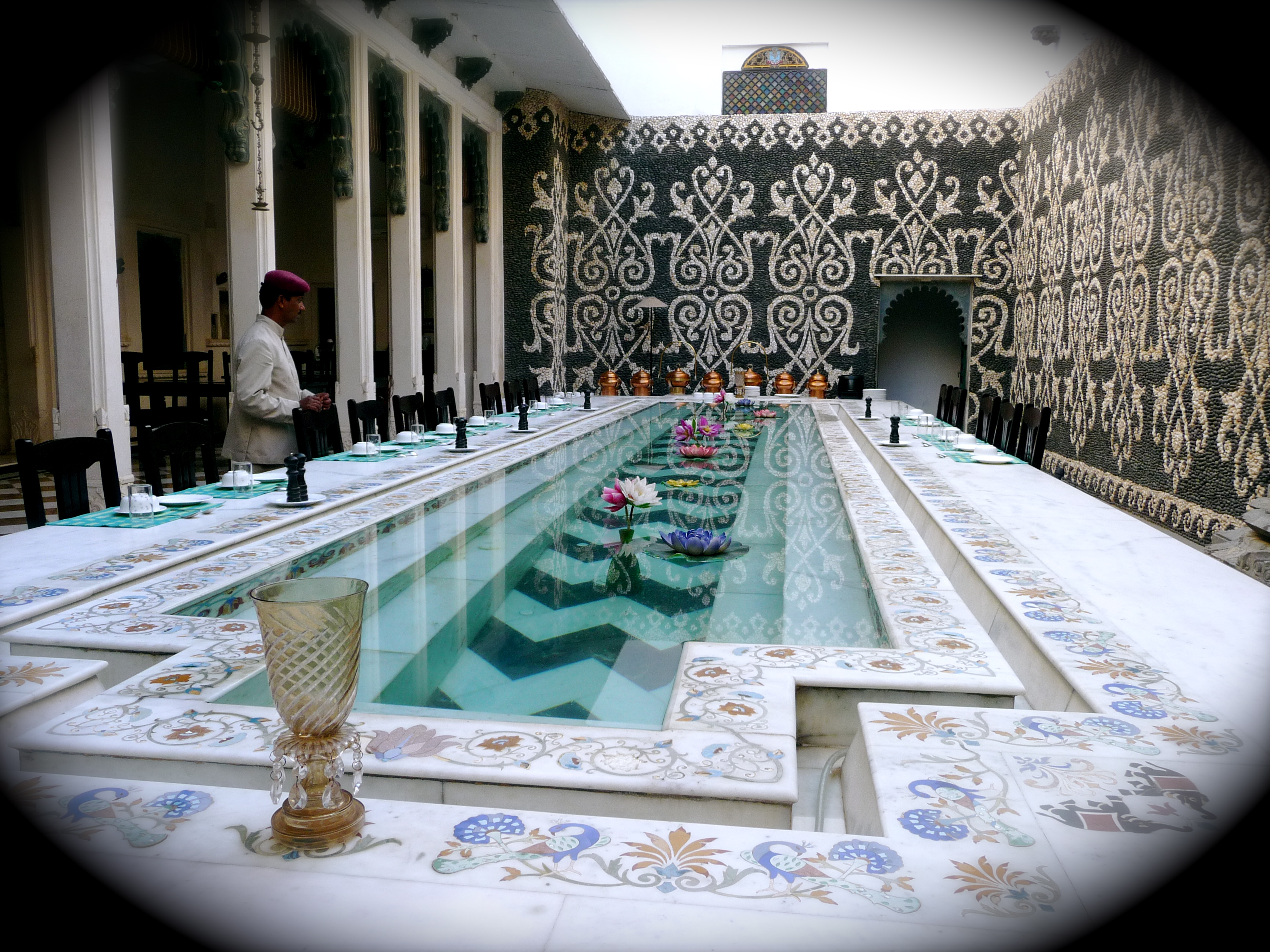 We walk into the adjacent palace courtyard and around an exquisitely carved temple surrounded by water, to one more interior courtyard. In the middle is an enormous white marble dining table set for thirty people. Carved into the centre of the table is a long rectangular pool filled with lotus flowers and goldfish. “This is where you will eat breakfast and dinner,” the manager tells us.